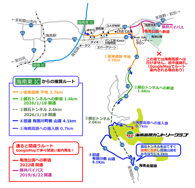 - 2026年1月18日開通した鏡石トンネルを通過し、トンネルを出てすぐ鋭角に左折し、道なり4.1kmほどに走ると海南高原カントリークラブへ到着します。